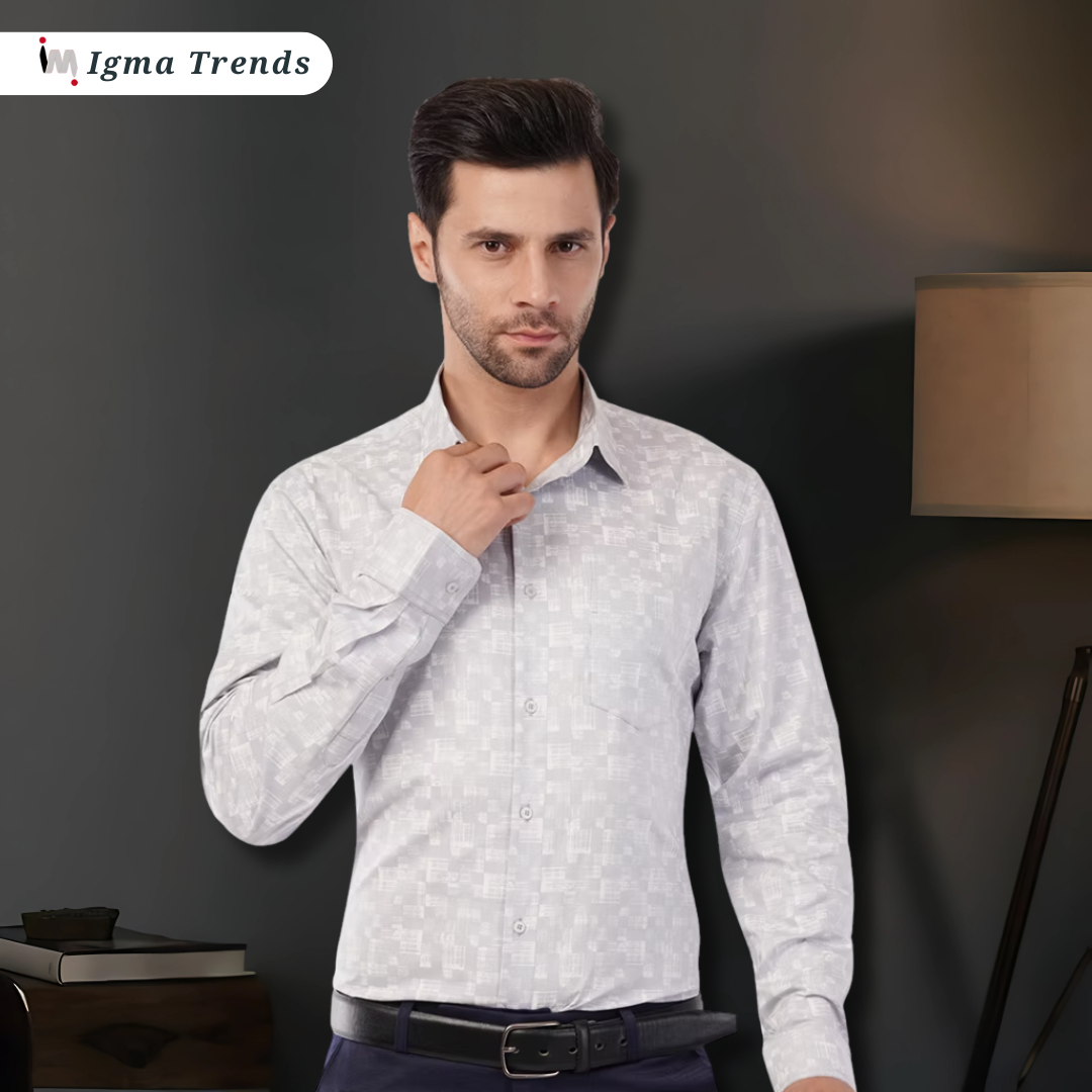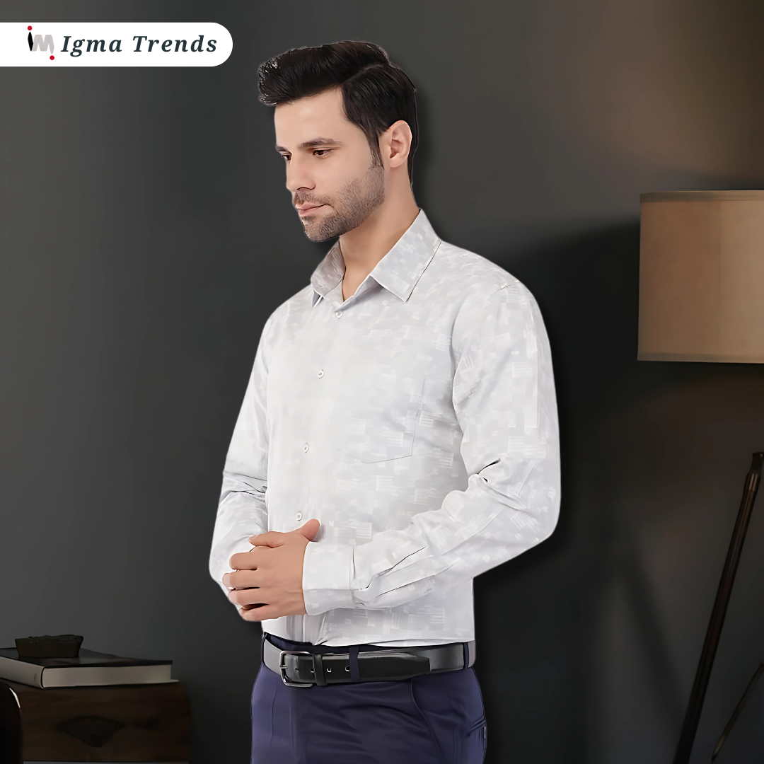 Attribute Description Fabric Made from premium-quality cotton blend for breathability and ease of wear Color Elegant light grey with abstract white print Design Modern artistic print pattern for a distinctive and stylish look Fit Slim-fit design for a sleek and tailored silhouette Details Classic spread collar, button-down closure, and a functional chest pocket for added utility Versatile Complements formal trousers, chinos, or denim for both polished and casual styles .